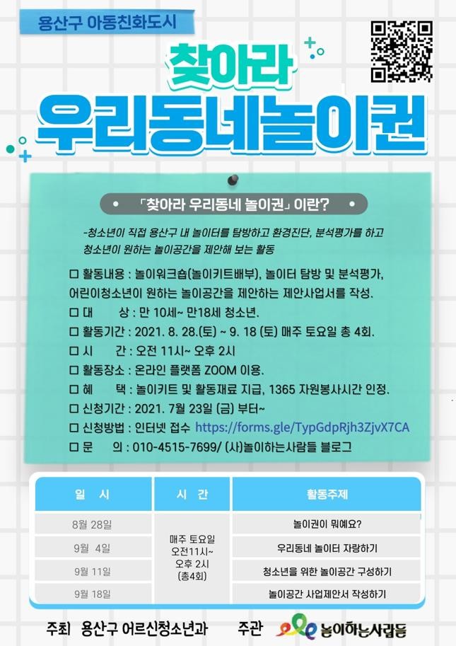 놀이기획단은 당초 정원 20명이 팀을 구성해 용산구 놀이터를 탐방하고 시설들을 분석·평가하는 대면 강좌로 기획했으나 사회적 거리두기 단계 격상에 따라 줌(ZOOM)을 이용해 정원 제한 없이 운영한다.
