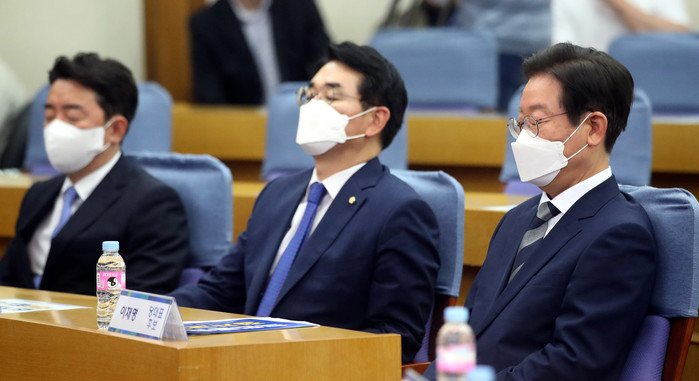 ▲ 더불어민주당 이재명(오른쪽부터), 박용진, 강훈식 당 대표 후보가 29일 오전 국회 의원회관에서 열린 더불어민주당 국민통합 정치교체 추진위원회 당 대표 후보자 초청 공개토론회에 참석해 있다. 2022.7.29 [국회사진기자단]