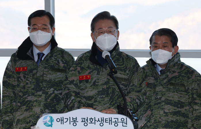 ▲ 더불어민주당 이재명 대선후보는 28일 경기도 김포시 애기봉평화생태공원 해병대 2사단에서 해병대를 사실상 해군에서 독립시켜 육해공 '3군 체제'를 '준 4군 체제' 개편안을 발표하고 있다. 2022.1.28