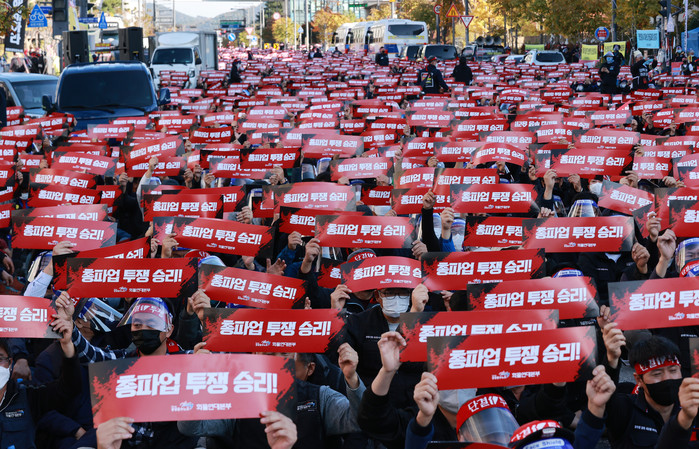 [열린의정뉴스 = 김윤영 기자] 29일 오후 정부세종청사 국토교통부 부근에서 열린 총파업 결의대회에 참가한 공공운수노조 화물연대 조합원들이 구호를 외치고 있다. 2021.10.29