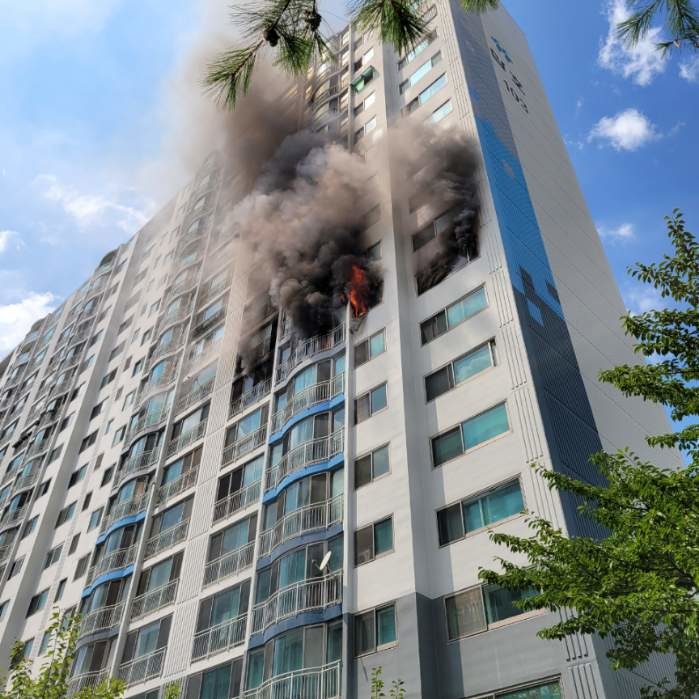 [열린의정뉴스 = 최제구 기자] 5일 오후 1시 50분께 광주 북구 일곡동 한 아파트 8층에서 불이 나 28분여만에 인명피해 없이 진화됐다. 사진은 불이 나고 있는 모습. 2021.8.5 [광주 북구청 제공. 재판매 및 DB 금지]