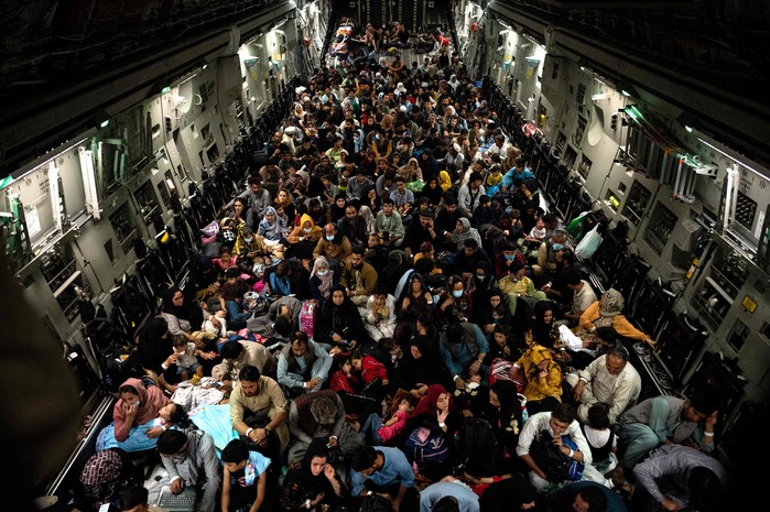 | ▲ 19일(현지시간) 탈레반 정권을 피해 아프가니스탄 카불 국제공항을 떠난 민간인들이 미군 수송기 내부에 가득 들어차 있다. [미군 중부사령부 제공. 재판매 및 DB 금지] |