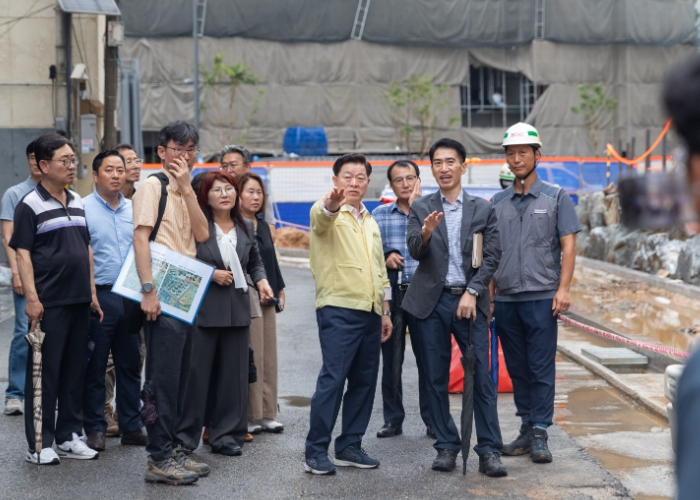 14일 오전 광명초 임시 통학로 정비 현장 찾아 현장 확인하고 시공사에 당부