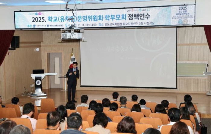 [코리아 이슈저널=홍종수 기자] 충청북도영동교육지원청은 14일 영동교육지원청 학교지원센터 3층 시청각실에서 관내 유·초·중·고등학교 운영위원, 학부모회 임원, 학교(원)장, 행정실장 120여 명을 대상으로 2025. 학교(유치원)운영위원회·학부모회 정책연수를 실시했다.