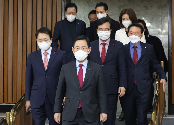 | ▲ 국민의힘 주호영 원내대표가 16일 오전 국회에서 열린 원내대책회의에 참석하고 있다. 앞줄 왼쪽부터 국민의힘 성일종 정책위의장, 주 원내대표, 송언석 원내수석부대표, 김석기 사무총장. 2022.12.16 |
