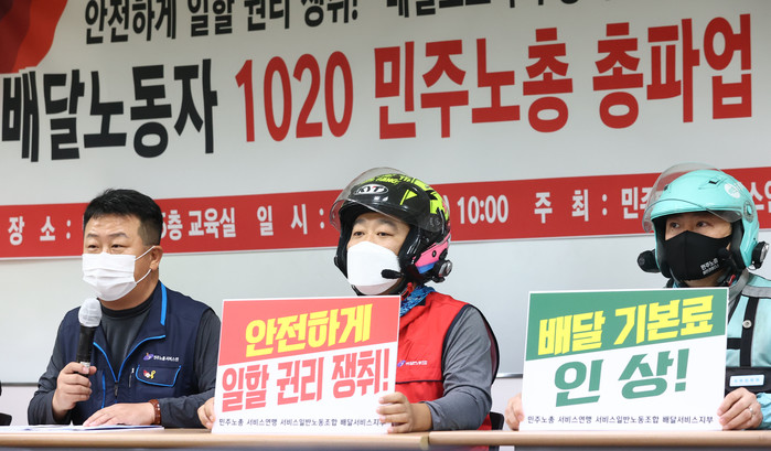 [열린의정뉴스 = 김윤영 기자] 15일 오전 서울 중구 정동 민주노총에서 민주노총 서비스연맹 배달서비스지부 관계자 등이 배달노동자 10·20 민주노총 총파업 돌입 기자회견을 하고 있다. 2021.10.15