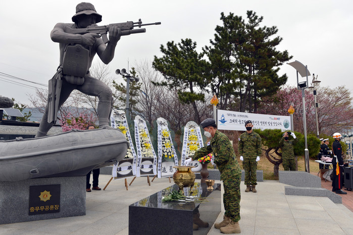 [열린의정뉴스 = 김윤영 기자] 천안함 실종자 구조 과정에서 순직한 고 한주호 준위를 기리는 12주기 추모식이 30일 경남 창원시 진해구 한주호 동상 앞에서 거행되고 있다. 2022.3.30