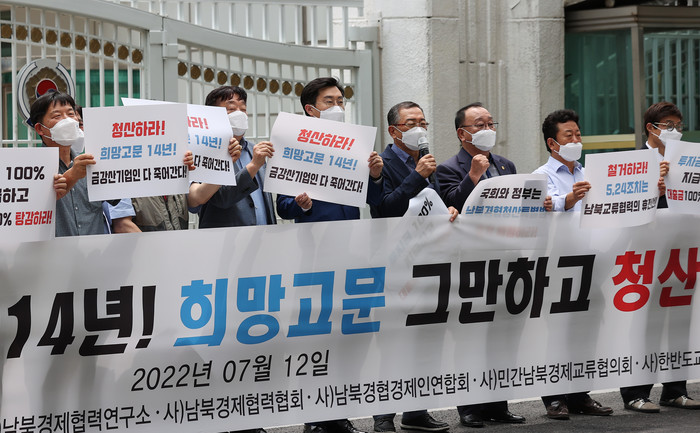 | ▲ 금강산기업협회·금강산투자기업협회 등 회원들이 12일 오전 서울 종로구 정부서울청사 후문에서 금강산관광 등 대북 투자기업 투자금 지원 등의 내용이 포함된 남북경협청산특별법 입법을 촉구하며 구호를 외치고 있다. 2022.7.12 |