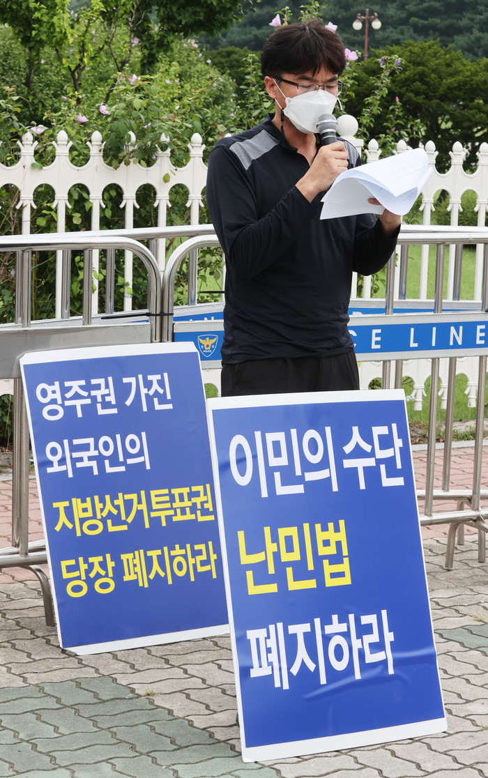 [열린의정뉴스 = 김윤영 기자] 26일 오후 서울 여의도 국회 앞에서 난민대책 국민행동 회원이 아프간 난민 수용 반대 기자회견을 열고 발언하고 있다. 2021.8.26
