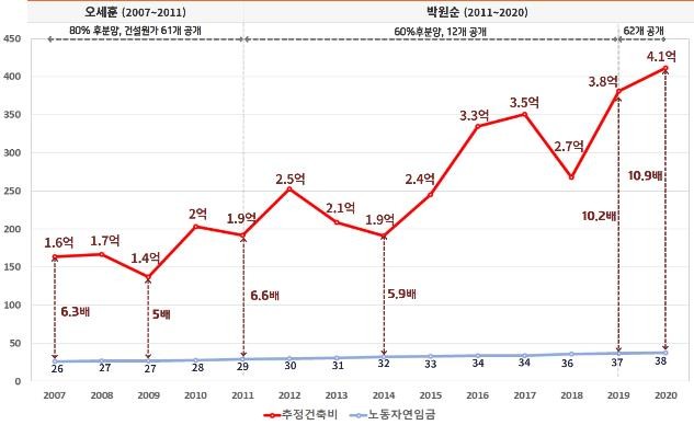 서울시장 재임기별로 나눠보면 평당 추정건축비는 오세훈 시장 재임기인 2007년 548만원에서 2011년 639만원으로, 5년간 91만원(17%) 늘었다.