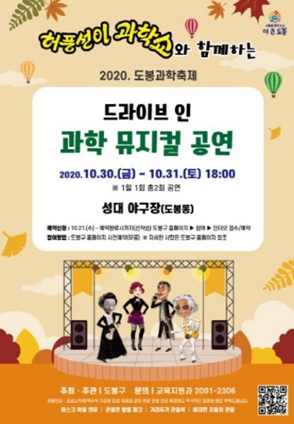 [열린의정뉴스 = 김진성 기자] 서울 도봉구(구청장 이동진) 성대 야구장에서 오는 30일, 31일 양일간 드라이브인 '과학 뮤지컬로 만나는 2020 도봉과학축제'가 열린다.