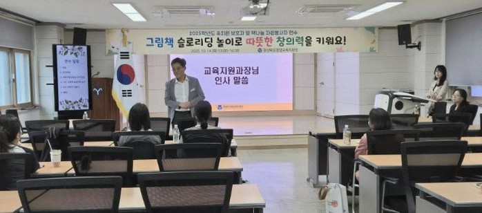 [코리아 이슈저널=김태훈 기자] 경상북도영양교육지원청은 2025년 10월 14일 영양교육지원청 대회의실에서 ‘그림책 슬로리딩 놀이로 따뜻한 창의력을 키워요’라는 주제로 관내 유치원, 어린이집 및 초등 1, 2학년 학생과 학부모를 대상으로 2025 유치원·초등 저학년 보호자 및 책나눔 자원봉사자 연수를 개최했다.