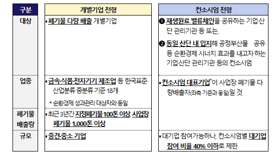 이번 지원사업에는 폐기물을 대량으로 배출하는 제조업종에 해당하는 기업 누구나 신청할 수 있다. 아울러 순환경제 협력 모델의 핵심 주체인 폐기물 다량 배출 대기업 및 중견기업을 비롯해 폐자원 공급망을 공유하거나 동일 산업단지에 입지하고 있는 협력기업 및 산업단지 관리기관과 협력체(컨소시엄) 형태로 참여할 수 있다.