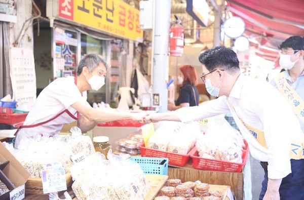 ▲ 지난 22일 이정훈 강동구청장이 추석을 앞두고 둔촌역 전통시장을 찾아 시장상인을 격려하며 주먹인사를 나누고 있다.[출처=강동구청]