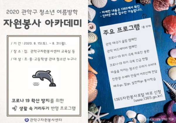또 광복절에 진행되는 '관악 태극기 올림'을 시작으로 ▶자원봉사 기본 교육인 '자원봉사? 알go하자!' ▶관악 버드세이버 ▶코로나19 위기 극복 긴급 헌혈 캠페인 ▶마을을 지키는 청소년 꾸러기 수비대 등 주변 이웃에게 재능과 사랑을 나눌 수 있는 다양한 프로그램이 준비돼 있다.