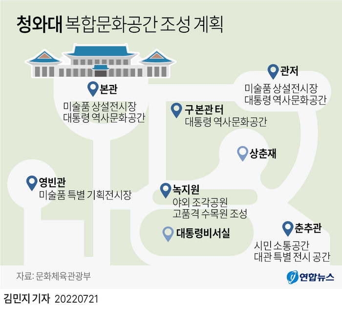 박보균 문체부 장관은 이날 국회 문화체육관광위원회 전체회의에서 국민에 개방된 청와대를 소장 미술품과 대통령 역사가 담긴 건축물, 야외 공간의 자연, 옛 문화재가 어우러진 문화예술 랜드마크로 재구성하겠다고 말했다.