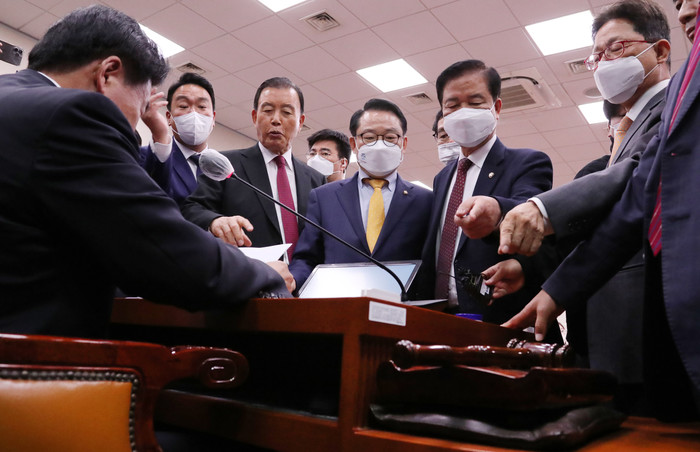 | ▲ 소병훈 농해수위원장이 19일 오전 국회에서 양곡관리법 일부개정법률안 처리를 위해 농림축산식품해양수산위원회 전체회의를 개회하려 하자 국민의힘 위원들이 항의하고 있다. 2022.10.19 [국회사진기자단] |
