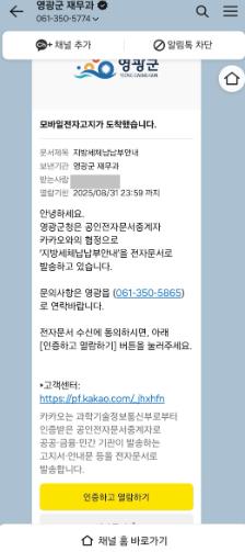 [코리아 이슈저널=김종오 기자] 영광군은 지난 8월 5일에 이어 오는 9월 11일, 지방세 납부 기한을 넘긴 체납자를 대상으로 **'카카오 알림톡'**을 활용한 모바일 전자고지 2차 전송을 시행한다고 밝혔다.