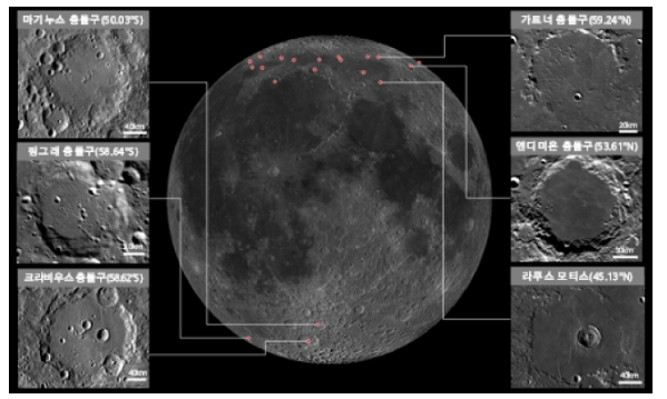 | ▲ 위도 40°~70° 범위 내 달 착륙지 후보 지역 예시. 위의 지역을 포함한 남·북반구 약 30여개 후보 지역을 상세 분석하여 착륙지 선정 예정(우주항공청) |