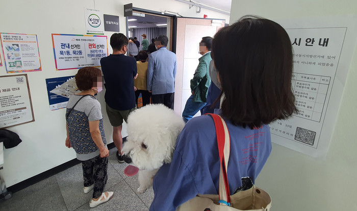 ▲ 주말인 28일 중랑구 묵1동 사전투표소에서 시민들이 순서를 기다리고 있다. 2022.5.28