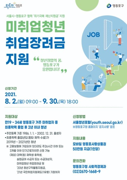 채현일 영등포구청장은 “힘든 시기를 보내는 미취업 청년들에게 실질적 도움을 주기 위해 취업장려금을 추가로 지원하게 됐다”라며, “많은 청년들이 지원을 받아 다시금 취업의지를 다지는 계기가 되고, 상품권 사용을 통해 지역 경제 활성화에도 도움이 되길 기대한다.”고 전했다.