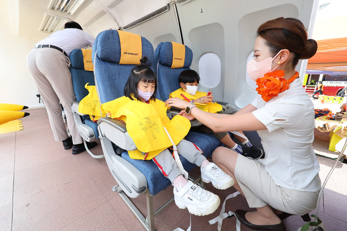 [열린의정뉴스 = 김윤영 기자] 23일 오후 서울 여의도광장에서 열린 2022 서울안전한마당을 찾은 어린이들이 제주항공 부스에서 비상시 여객기 행동을 체험하고 있다. 2022.9.23