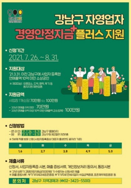 온라인 신청은 26일부터 강남구청 홈페이지(gangnam.go.kr)에서 사업자등록증, 매출액 증빙자료를 첨부하면 된다.