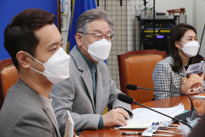 이날 회의는 기존과 달리 '전 국민 선대위'라는 이름으로 이 후보가 청년들과 간담회 하는 형식으로 진행됐다.