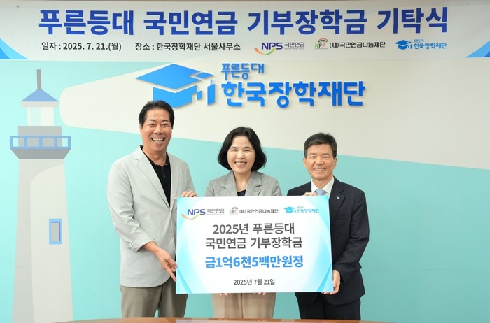 국민연금공단(이사장 김태현)은 21일 한국장학재단 서울사무소에서 열린 ‘푸른등대 기부장학금’ 기탁식을 통해 연금수급자 가정의 대학생을 위한 장학금 1억 6,500만 원을 전달했다고 밝혔다.