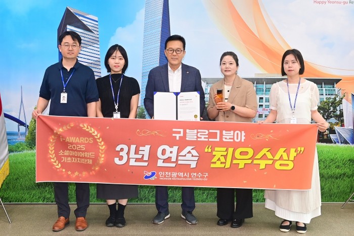 [코리아 이슈저널=홍춘표 기자] 연수구가 25일 (사)한국인터넷전문가협회가 주최한 ‘소셜아이어워드 2025’에서 기초자치단체 분야(구) 블로그 부문에서 3년 연속 최우수상을 수상하는 쾌거를 올렸다.