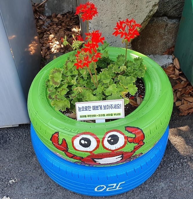 박창훈 오라동주민센터 주무관은 "쓰레기도 잘만 활용하면 자원이 될 수 있다는 생각에 먼저 주변에서 구하기 쉬운 폐타이어를 활용해보고자 했다"며 "특히 폐타이어는 절단하는 과정에서 또 다른 환경오염을 야기할 수 있어 변형 없이 사용하는 방법을 찾다 화분을 만들기로 했다"고 말했다.
