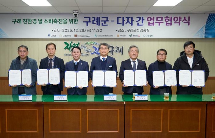 [코리아 이슈저널=김종오 기자] 구례군은 친환경 농업의 가치를 확산하고 쌀 소비 기반을 강화하기 위해 공공·금융·농협·민간이 참여하는 다자간 업무협약을 지난 12월 26일 군청 상황실에서 체결했다.