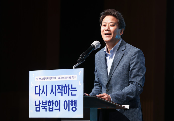 ▲ 임종석 남북경제문화협력재단 이사장이 21일 오전 서울 중구 대한상공회의소 국제회의장에서 열린 '다시 시작하는 남북합의 이행' 주제의 전국 남북교류협력 지방정부협의회·남북경제문화협력재단 토론회에서 발표하고 있다. 2021.6.21 [연합뉴스 제공]