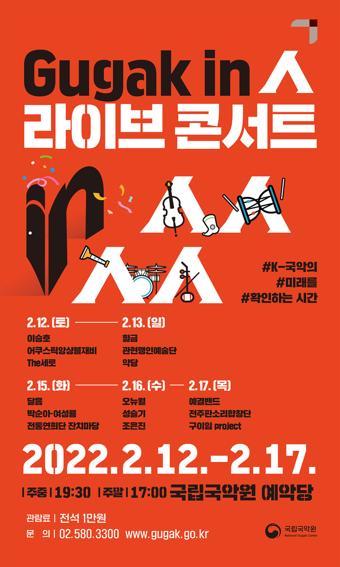 공연에선 국립국악원의 온라인 국악 뮤직비디오 제작 사업인 '국악인(Gugak in 人)'에 선정된 50팀 중 15팀이 무대에 올라 다채로운 국악의 매력을 선사할 예정이다.
