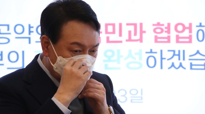| ▲ 국민의힘 윤석열 대선 후보가 23일 서울 여의도 한 카페에서 열린 '국민공약 언박싱 데이' 행사에서 마스크를 고쳐쓰고 있다. 2022.1.23 [국회사진기자단] |