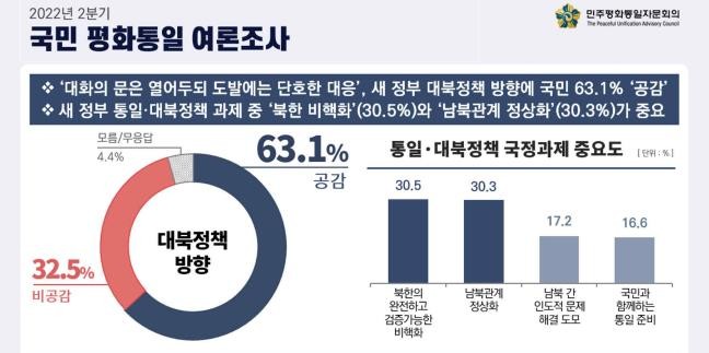 이 조사에서 "북한과의 대화의 문은 열어두되 도발과 같은 불법행위에 대해선 원칙에 따라 단호하게 대응한다"는 새 정부의 대북정책 방향에 대해 응답자의 63.1%가 '공감한다'고 답했다. '매우 공감한다'고 응답한 비율은 35.1%, '다소 공감한다'는 응답률은 28.0%였다.