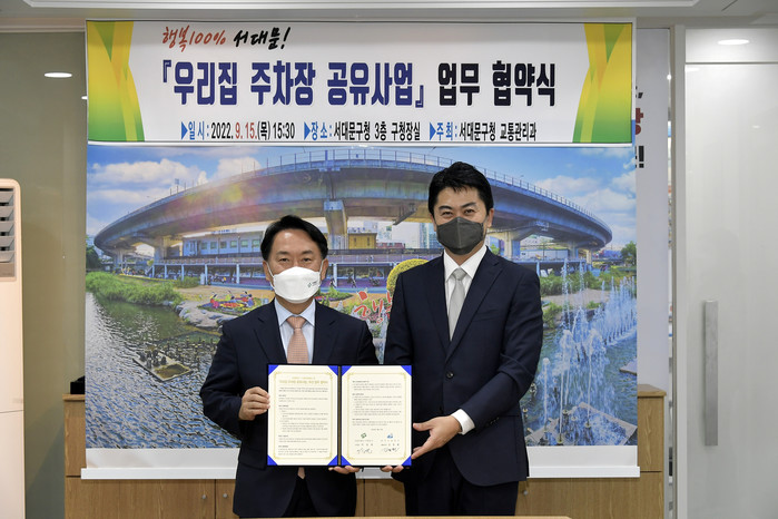 ▲ 서울 서대문구(구청장 이성헌)는 주택가 주차난 해소를 위해 온라인 주차 플랫폼 운영사인 모두컴퍼니와 '우리 집 주차장 공유 사업'을 한다고 16일 밝혔다. 지난 15일 서대문구청에서 열린 업무 협약식에서 이성헌 서대문구청장(왼쪽)과 김동현 모두컴퍼니 대표이사가 기념촬영을 하는 모습. 2022.09.16. [서대문구 제공. 재판매 및 DB 금지]