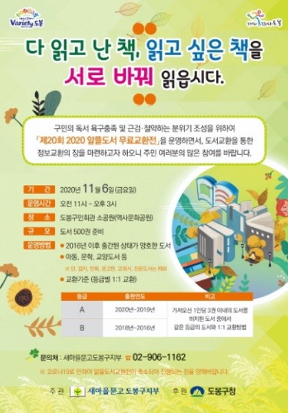 [열린의정뉴스 = 김진성 기자] 서울 도봉구(구청장 이동진)는 오는 6일 도봉구민회관 창동역사문화공원에서 '2020 알뜰도서교환전'을 연다. 구민들의 독서 욕구를 해소하고 나눔 문화와 책 읽는 분위기 조성을 위해서다.