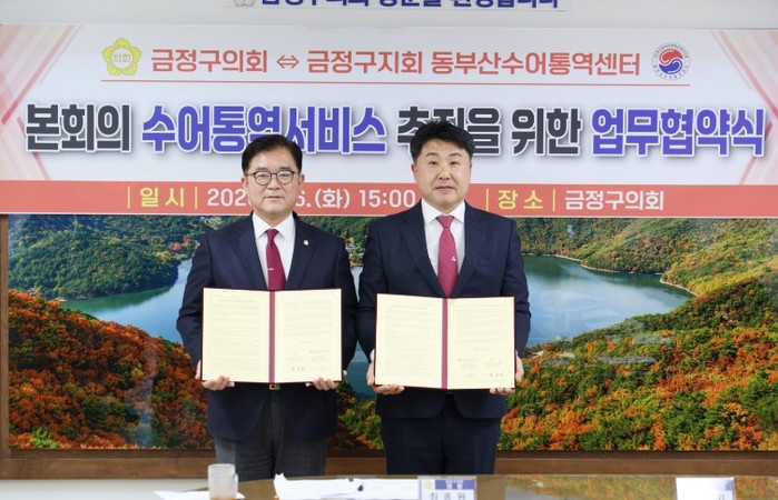 [코리아 이슈저널=김태훈 기자] 금정구의회는 2026년 1월 6일, 금정구의회 의장실에서 동부산수어통역센터(센터장 여복기)와 '본회의 수어통역 서비스 제공을 위한 업무협약'을 체결했다.