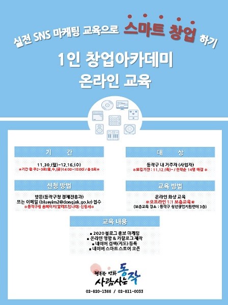 [열린의정뉴스 = 이창희 기자] 동작구(구청장 이창우)가 오는 12월까지 관내 소재 (예비)창업자를 대상으로 「온라인 1인 창업아카데미」를 운영한다고 23일 밝혔다.