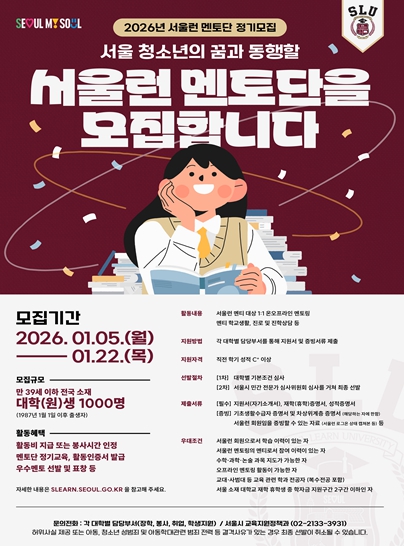 [코리아 이슈저널=최준석 기자] 서울시는 대학생들이 자신의 지식과 경험을 나누며 장학금 혜택과 취업 역량까지 쌓을 수 있는 ‘서울런 멘토단’ 신규 멘토 1,000명을 22일까지 모집한다.