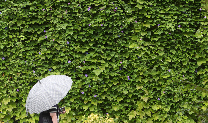 [열린의정뉴스 = 김윤영 기자] 비가 내린 25일 경기도 수원시청 벽면에 설치된 그린 커튼 앞을 우산을 쓴 시민이 지나고 있다. 2021.8.25