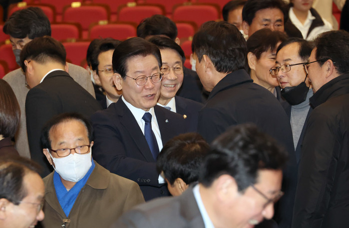 | ▲ 더불어민주당 이재명 대표가 17일 국회 의원회관에서 열린 전국지역위원장·국회의원 긴급 연석회의에서 참석자들과 인사하고 있다. 2023.2.17 |