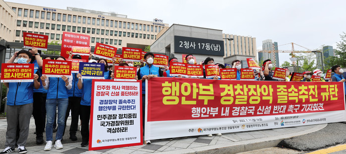 [열린의정뉴스 = 김윤영 기자] 국가공무원노동조합 경찰청지부, 경찰청주무관노동조합 관계자들이 11일 오후 세종시 정부세종2청사 행정안전부 앞에서 행안부 내 경찰국 신설 반대촉구 기자회견을 열고 구호를 외치고 있다. 2022.7.11