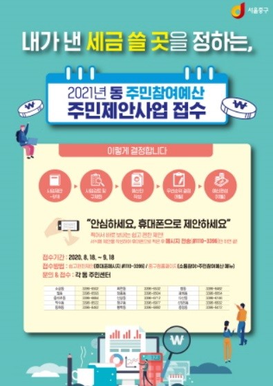 [열린의정뉴스 = 김진성 기자] 중구(구청장 서양호)가 2021년도 동주민센터 예산 편성을 위한 동 주민참여예산 주민제안사업 접수를 시작했다.