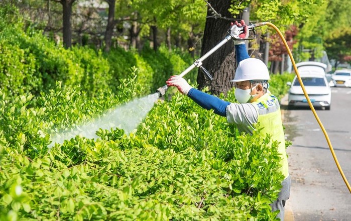 | ▲ 지난 20일 용산구청 공원녹지과 근로자가 녹사평대로 인근 수목을 세척 하고 있다 |