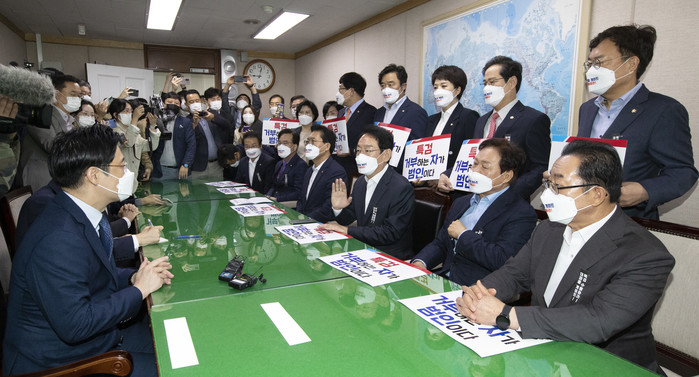 ▲ 김도읍 정책위의장 등 국민의힘 소속 국회 정무·행안·국토위원회 의원들이 13일 오전 2021년 국정감사에서 경기도와 성남시의 자료제출 비협조에 대한 항의로 경기도 수원 팔달구 경기도청을 방문해 오병권 행정1부지사와 면담하고 있다. 2021.10.13 [국회사진기자단]