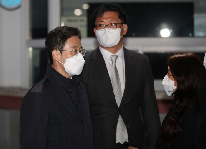 | ▲ '고발 사주' 의혹의 핵심 인물인 손준성 대구고검 인권보호관이 27일 오전 고위공직자 범죄수사처(공수처)가 청구한 구속영장이 기각된 뒤 대기하던 경기도 의왕 서울구치소에서 빠져나오다 취재진 질문을 받고 있다. [연합뉴스 제공] |