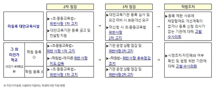 아울러, 교육부와 시도교육청은 이번 조치로 기관이 폐쇄되거나, 미인가·미등록 시설임을 인지하여 시설에서 이탈하는 학생·학부모에 대한 지원도 한층 더 강화한다.