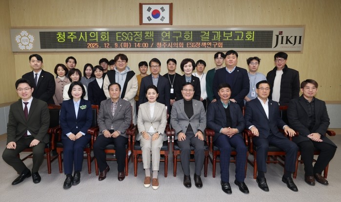 [코리아 이슈저널=홍춘표 기자] 청주시의회 ESG정책 연구회(대표 김은숙 의원)는 9일, 청주시의회 특별위원회실에서 ‘청주시의회 ESG정책 연구회 활동 결과보고회’를 개최하고, 지난 7개월 간의 연구활동을 정리하며 향후 정책 추진 및 조례 제정을 위한 논의의 장을 마련했다.